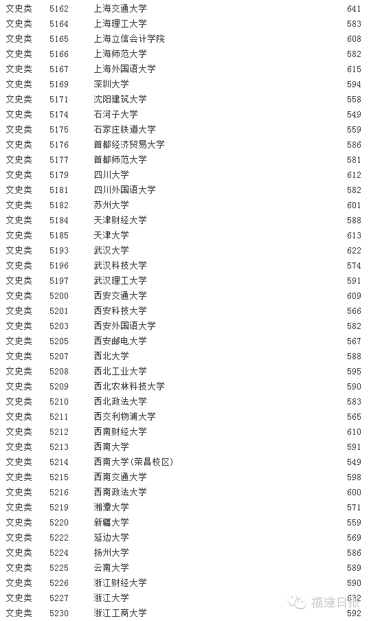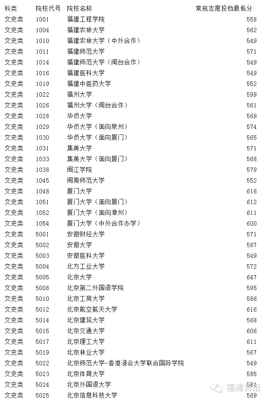文史类本一批次常规志愿投档最低分:清华大学650分,北京大学647分,厦门大学616分,福州大学599分。
