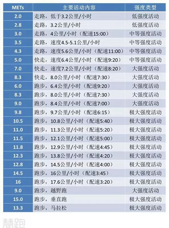 从下表中可以看到,普通步行(4-6公里/小时)都属于中等强度活动,快走(7.2公里/小时)已经是大强度活动。而只要是双脚离地的跑步,无论速度快慢,就是属于大强度活动。因为双脚离地意味着腾空,腾空就代表需要肌肉收缩克服体重做功,所以举例来说,6.4公里/小时的快走,MET值为5,属于中等强度活动,而6.4公里/小时的慢跑,MET值为6,已经属于大强度活动,跑得越快,当然强度越大,MET值越高。快在下表中找到你平时跑步配速所对应的MET水平吧。