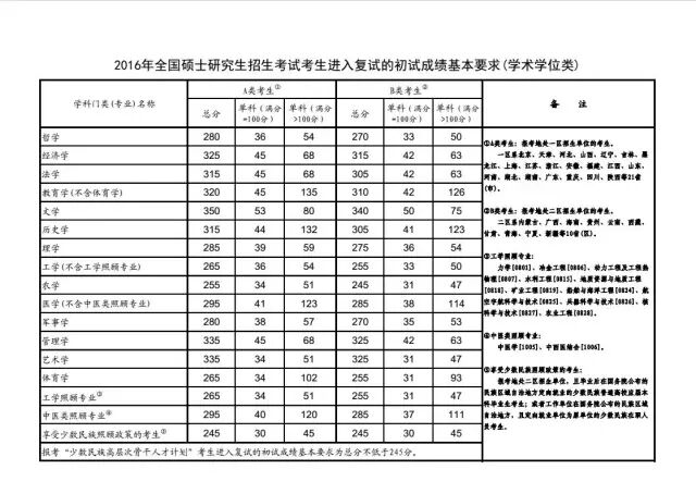 附一:2016年全国硕士研究生招生考试考生进入复试的初试成绩基本要求(学术学位类)——可点大图