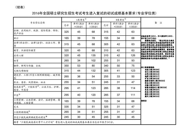 附二:2016年全国硕士研究生招生考试考生进入复试的初试成绩基本要求(专业学位类)——可点大图