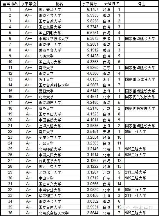 武书连2016中国721所大学教师学术水平排行榜发布,中科大、南大、浙大前三名。含台港澳大学的话,国立清华大学居首。