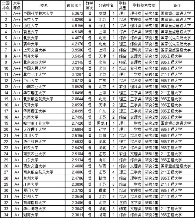 教师学术水平是大学各项办学指标中最重要的指标之一。2016年,在这项指标的竞争中,有15所大学获得A++级的最高等级,其中中国科学技术大学以5.3673分获第1名,南京大学4.8260分得第2名,浙江大学4.6155分取第3名。