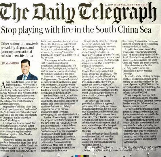 近来,英国公众十分关注即将举行的英欧关系公投,但南海地区形势发展同样值得关注。尽管英国公众对南海问题了解不深,但关于中国是否必须接受菲律宾南海仲裁庭即将宣布的仲裁结果已成为讨论焦点。有人表示,如果中国不接受仲裁结果,就是破坏了“基于规则的国际秩序”,南海和平稳定就岌岌可危。我们绝不同意此类指责。