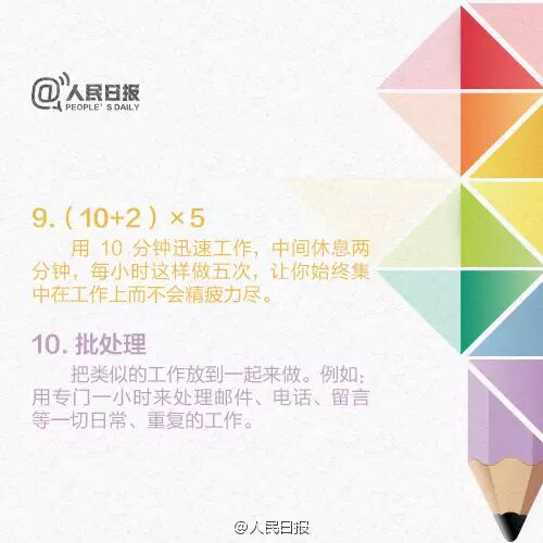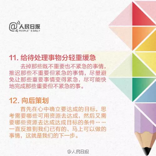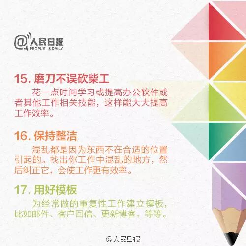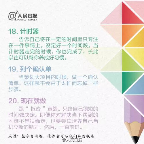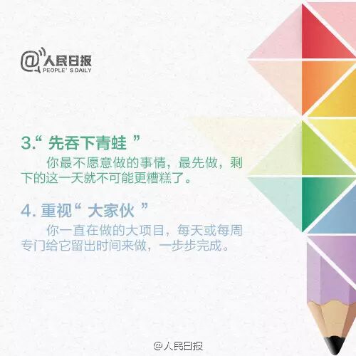 工作繁重,效率低下,熬夜加班,压力山大?试着①“先吞下青蛙”:从最不愿意的事情开始做起;②磨刀不误砍柴工:花点时间学习工作相关技能;③保持整洁:纠正工作中混乱的地方;④向后策划:倒推你现在要做的事……20个实用技巧,对拖延症、焦虑症、工作效率低下都有效!