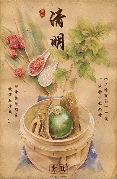 清明时节有吃青团的风俗习惯。青团是用一种名叫“浆麦草”的野生植物捣烂后挤压出汁,接着取用这种汁同晾干后的水磨纯糯米粉拌匀揉和,然后开始制作团子。团子的馅心是用细腻的糖豆沙制成,在包馅时,另放入一小块糖猪油。团坯制好后,将它们入笼蒸熟,出笼时用毛刷将熟菜油均匀地刷在团子的表面,这便大功告成了。