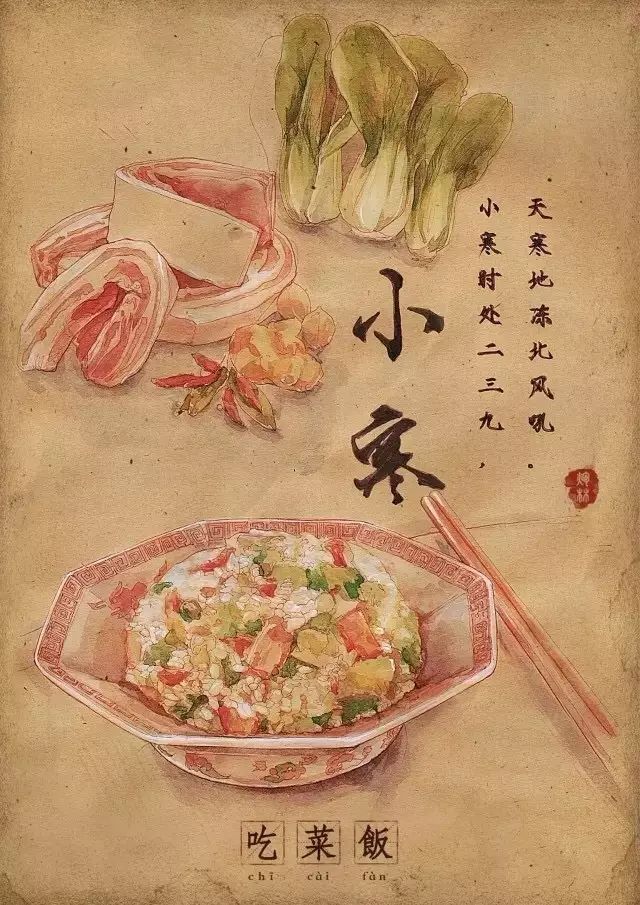 到了小寒,老南京一般会煮菜饭吃,菜饭的内容并不相同,有用矮脚黄青菜与咸肉片、香肠片或是板鸭丁,再剁上一些生姜粒与糯米一起煮的,十分香鲜可口。其中矮脚黄、香肠、板鸭都是南京的著名特产,可谓是真正的"南京菜饭",甚至可与腊八粥相媲美。