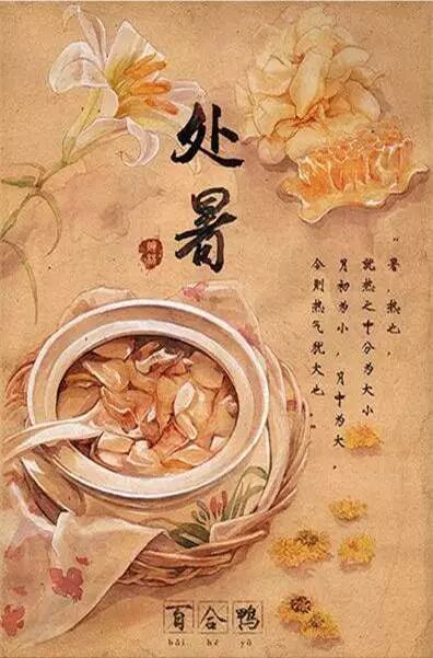 在我国许多地方,处暑意味着凉秋的开始。从这一天以后,我国大部分地区温差增大、昼暖夜凉;但是有的地方也会出现“秋老虎”的短暂高温天气。此时饮食应遵从处暑时节润肺健脾的原则,常吃些清热、生津、养阴的食物,如鸭子、百合。老鸭味甘性凉,因此民间有处暑吃鸭子的传统,做法也五花八门,有白切鸭、柠檬鸭、子姜鸭、烤鸭、荷叶鸭、核桃鸭等。北京至今还保留着这一传统,一般处暑这天,北京人都会到店里去买处暑百合鸭等。