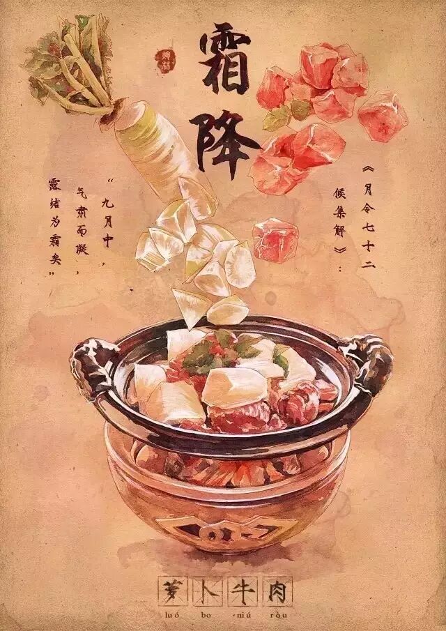 不少地方都有霜降吃牛肉的习俗。例如广西玉林,这里的居民习惯在霜降这天,早餐吃牛河炒粉,午餐或晚餐吃牛肉炒萝卜或是牛腩煲之类的来补充能量,祈求在冬天里身体暖和强健。