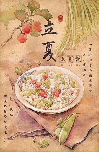 旧时,乡间用赤豆、黄豆、黑豆、青豆、绿豆等五色豆拌合白粳米煮成“五色饭”,后演变改为倭豆肉煮糯米饭,菜有苋菜黄鱼羹,称吃“立夏饭”。