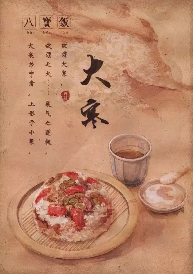 民间有大寒节气吃糯米的说法,因为糯米能够补养人体正气,吃了后会周身发热,起到御寒、养胃、滋补的作用。而糯米制作的食品,最典型的就是八宝饭。糯米蒸熟,拌以糖、猪油、桂花,倒入装有红枣、薏米、莲子、桂圆肉等果料的器具内,蒸熟后再浇上糖卤汁即成。味道甜美,是节日和待客佳品。