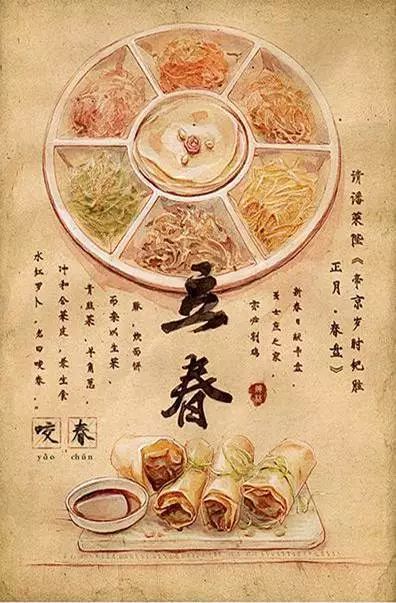 立春日吃春饼称为“咬春”。汉族民间在立春这一天要吃一些春天的新鲜蔬菜,既为防病,又有迎接新春的意味。唐《四时宝镜》记载:“立春,食芦、春饼、生菜,号‘菜盘’。”可见唐代人已经开始试春盘、吃春饼了。所谓春饼,又叫荷叶饼,其实是一种烫面薄饼--用两小块水面,中间抹油,擀成薄饼,烙熟后可揭成两张。春饼是用来卷菜吃的,菜包括熟菜和炒菜。