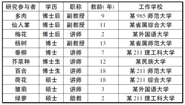 基于以上文献,我们发现目前研究仍旧有两个空缺:1)与其它领域相比,对高校青年外语教师的研究明显偏少;2)与量化研究相比,质性研究寥寥无几,对一线教师的研究更为鲜见。例如,李春梅(2015)采用了质性方法,聚焦研究的是“上进型”的大学英语青年教师。为了弥补现有空缺,本研究通过深度访谈,倾心聆听来自一线的10位高校青年英语教师内心的想法和诉求。具体要回答的研究问题是:这些一线教师对目前的生活、教学和科研最想倾诉的是什么?