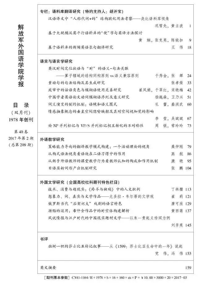 本期语料库翻译研究专栏刊登了3篇语料库翻译学研究文章。巩雪先、黄立波以类比语料库为研究平台,从“人称代词+的”这一欧化结构切入,考察了翻译对现代汉语的影响;黄娴、张克亮和陈晓扣应用收录1000个“使”字句句对的专题语料库,详细分析了“使”字句的英译方法;王伟则利用新闻英语长句平行语料库,分析了新闻英语长句与汉语语句之间的对应关系及其汉译方法。这些研究均属于以产品为导向的语料库翻译学研究,或论述英汉翻译对汉语的影响这一重要理论问题,或讨论英汉互译的策略与方法,对于语料库翻译学研究无疑会起到有力的推动作用。