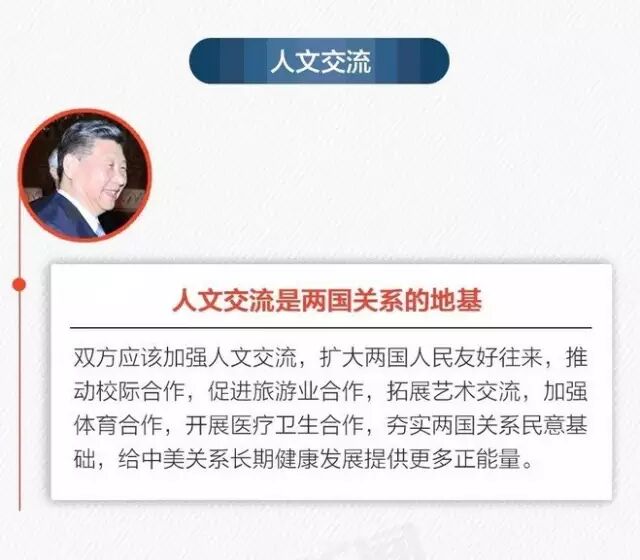 习近平强调,人文交流是两国关系的地基。两国人民对彼此素怀友好感情。双方应该加强人文交流,扩大两国人民友好往来,推动校际合作,促进旅游业合作,拓展艺术交流,加强体育合作,开展医疗卫生合作,夯实两国关系民意基础,给中美关系长期健康发展提供更多正能量。