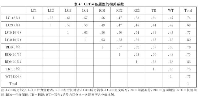 笔者首先分析了四级试卷各题型之间的相关以及各题型与总分的相关。表4是四级试卷各题型的相关系数矩阵。
