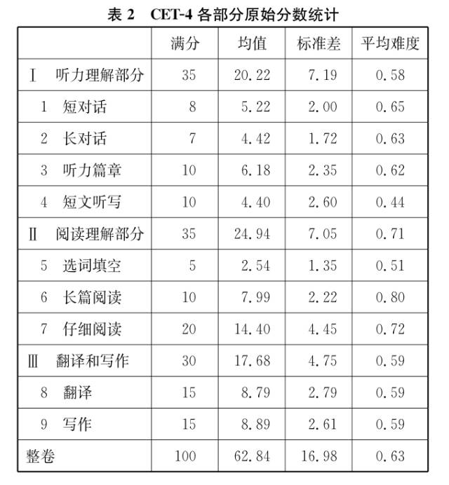 从试卷各个大的部分来看,听力理解部分的总体难度(0.58)与翻译和写作部分的总体难度(0.59)基本相当,难度适中。而阅读理解部分的整体难度为0.71,相对略易。因此,整份试卷的平均难度为0.63,表明四级试卷的难度是适中的。另外,数据还显示总分标准差较大,说明考生能力分布的离散程度较大,试卷能够很好地将考生能力区分开来。