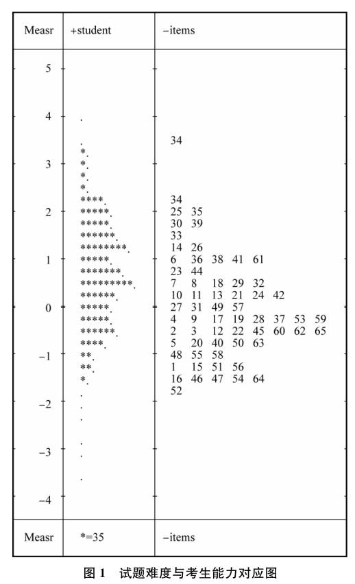 Rasch模型将试题难度和考生能力都转化为以logit为单位的统一度量值,并将两者在共同的标尺上进行度量,因而可以直接比较考生与考生、考生与试题、试题与试题的差异。图1直观地展现了试题难度与考生能力之间的对应关系。
