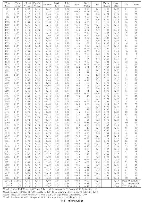 除此之外,图2最下方的分隔系数(Separation)和分隔信度(Reliability)用以衡量个体之间存在差异的程度,数值越大说明越有把握认为个体之间存在明显差异。信度的取值范围为0~1,越接近于1表明差异越大。卡方检验旨在检验个体之间是否具有统计学意义上的显著差异。图2的数据显示,分隔系数为24.33,信度达到了1.00,卡方值为33023.2(d.f.=64),显著性为0.00,这些都表明各题目之间的难度有显著意义的区别,符合试卷设计的要求。