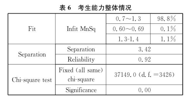 鉴于考生人数较多,这里仅报告整体的考生能力情况,不再一一罗列个体的数据。表6显示了考生整体情况的分析结果。
