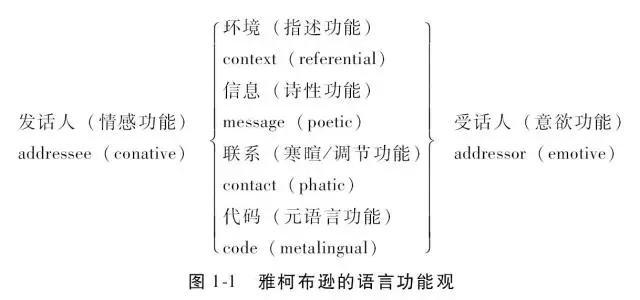 1960年,布拉格学派的雅柯布逊通过全面考察言语交际行为的六个构成要素,相应得到由这六要素决定的语言六功能,图1-1综合表现了雅柯布逊的语言功能观。