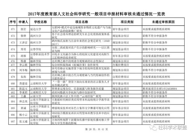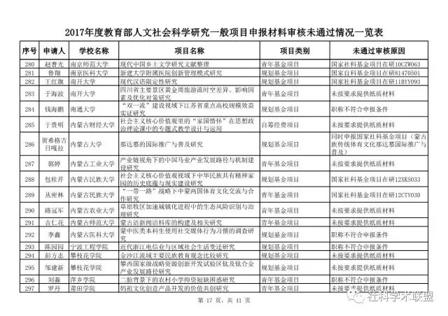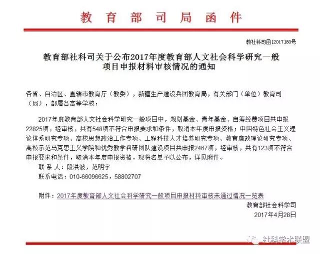 2017年4月28日,教育部官方网站发布了2017年度人文社会科学研究一般项目申报材料审核情况的通知。