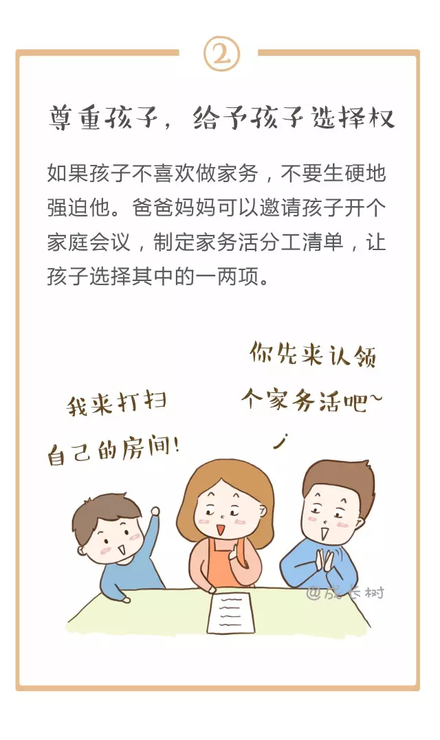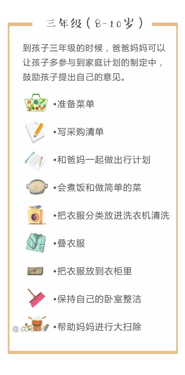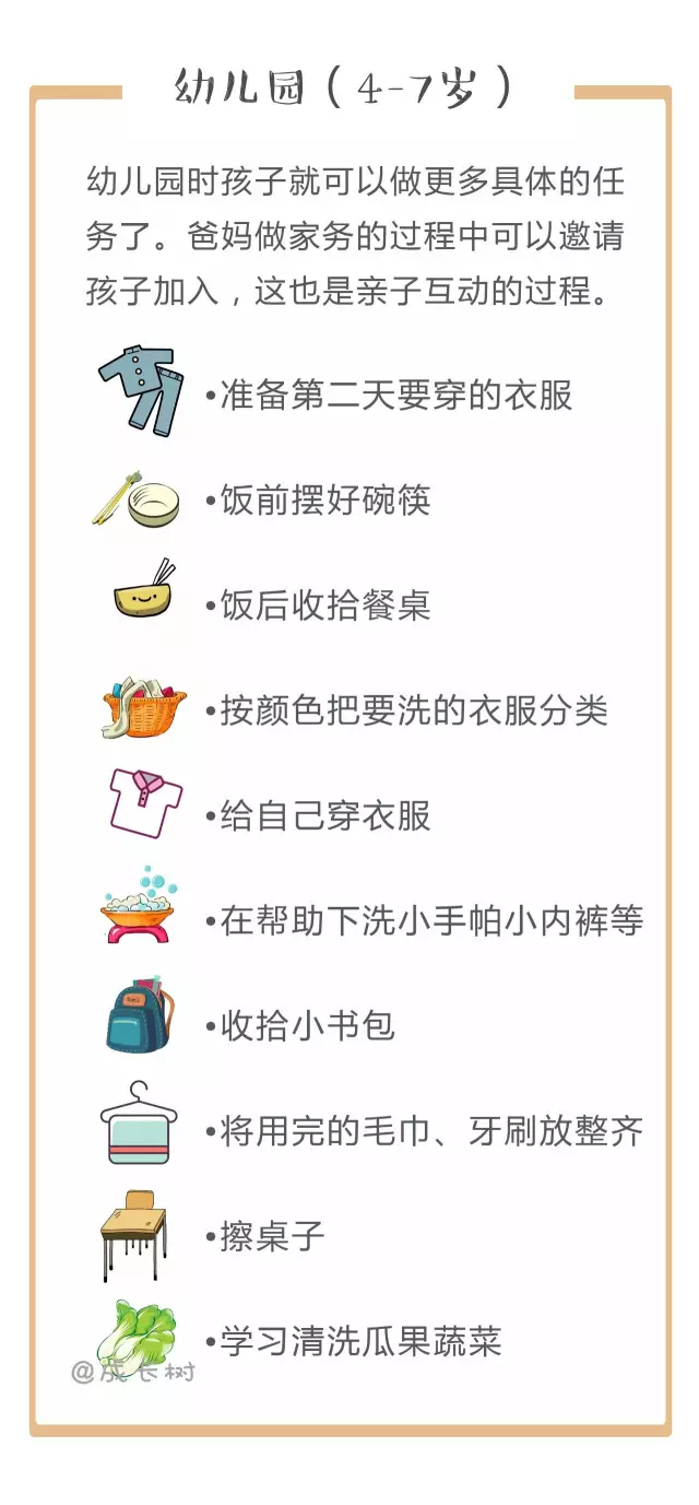其实从孩子3岁开始,妈妈们就可以有意识地培养孩子做家务了。对照下面的家务年龄表,妈妈们可以更好地把握什么年龄的孩子该做哪些家务↓↓