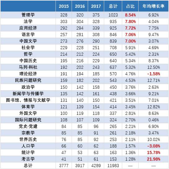 从2015至2017年,国家社科基金研究项目涉及23个学科领域。其中,资助项目最多的学科领域为管理学,三年累计立项1023个,占比8.54%。另外,法学、应用经济学、语言字、中国文学也是社科基金资助的重点学科。反之,人口学、统计学、考古学三个学科总体资助比例较低。另一方面,从年均增长情况来看,考古学、统计学增长幅度相对较大,理论经济学与人口学呈负增长态势,但总体情况较为平稳。