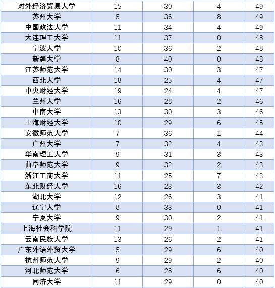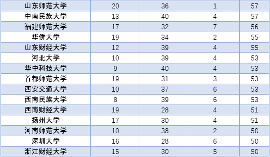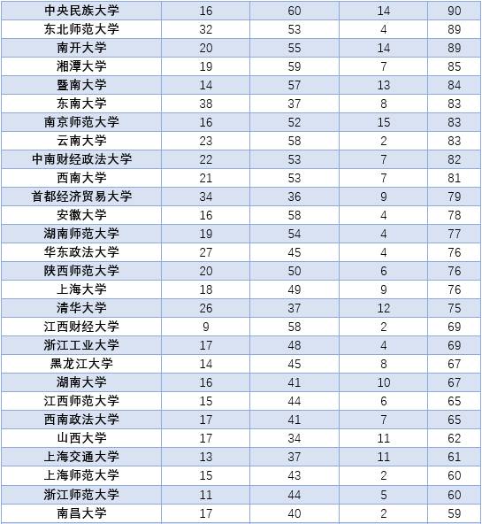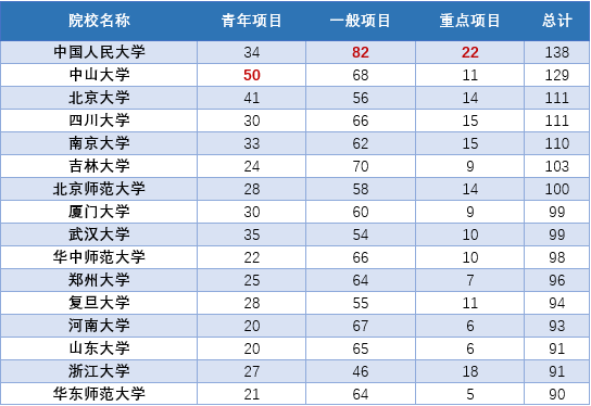 此外,从项目所处高校分布来看,共涉及全国800所高校。其中,中国人民大学三年共计立项138个,位居国内高校第一。另外,中山大学、北京大学、四川大学、南京大学、吉林大学、北京师范大学六所高校总立项数也突破100,位居国内高校前列。在各类项目中,中国人民大学在一般项目与重点项目立项总数仍旧位居国内高校之首,从侧面表现出其在社科研究领域科研生产力表现不凡。立项总数前100位高校具体名单见下表。