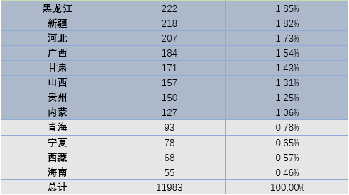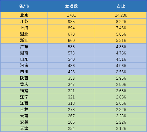 由下表可知,国家社科基金研究项目区域分布差异显著,集中化特点突出。其中,北京占据绝对优势,立项总数达到1701项,占比14.20%,最少的为海南省,立项总数为55项,占比0.46%,二者相差30倍之多。此外,江苏、上海,湖北、浙江优势也相对明显。各省份具体数据见下表: