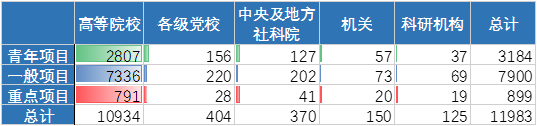 经统计,近三年国家社科基金项目立项总数达到11983项。其中,青年项目3184项(占比26.57%),一般项目7900项(占比65.93%),重点项目899项(占比7.50%)。