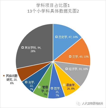 本次333个项目共涉及21个学科分类,其中历史学和文学为第一梯队,合计90个项目,总体占比27%,拔得头筹。第二梯队则包括了经济学、语言学、哲学、管理学、法学、民族问题研究6个学科分类,合计项目149,总体占比45%;快要占了半壁江山,也可谓是人文社科研究中的中流砥柱了。其余13个学科为第三梯队,合计项目94个,总体占比28%。